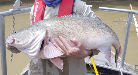 Figure 1: During drought times when the rivers stop flowing all fish, such as this impressive Murray cod caught and released during recent sampling in the Warrego River, rely on waterholes to survive. This new project is helping to model the quality of these vital waterholes to support healthy fish like this cod.