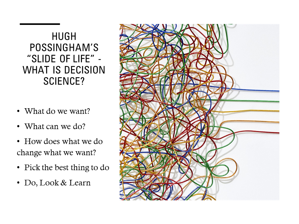Our keynote speaker, Hugh Possingham, Queensland Chief Scientist, was up next anchoring the focus on the vital role communication of science and technology plays in our modern era, offering his “Slide of Life”, as a simple 7-point plan for decision science (adapted below). Hugh reminded the room that modelling is not an activity restricted to big problems but, something we all employ in our everyday decision making.