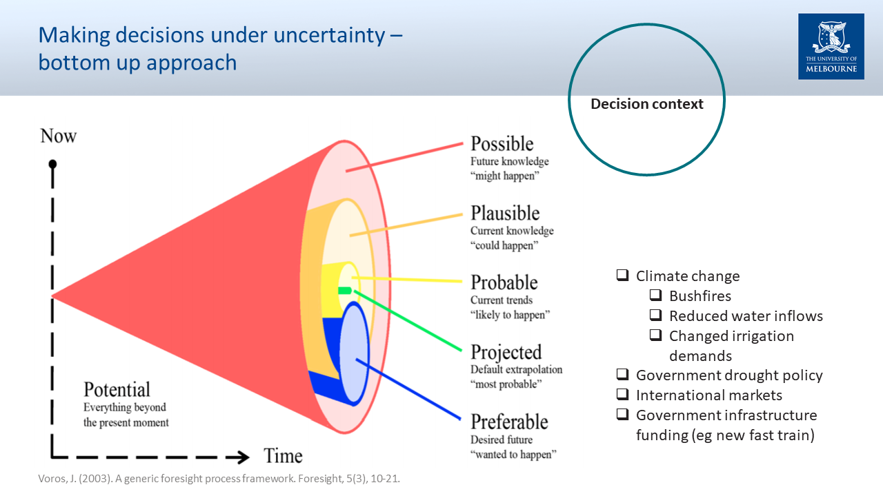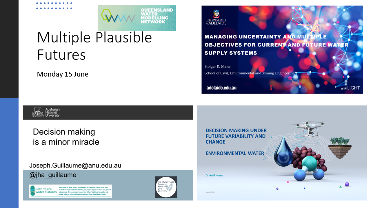 Dealing with Climate Change continues as a focus topic for our QWMN collective.  With the support of three interstate specialists, we explored the ability of water models to be better framed to deal with the extreme variability associated with influence of climate change.  This event – with the great title “Coping with multiple plausible futures in the face of climate changeproduced a rich set of presentations from Joseph Guillaume – UNE, Holger Maier The University of Adelaide and Avril Horne University of Melbourne which are now all online as an engaging recording All 3 presenters shared aspects that practioners working in this field, called Decision Making under Deep Uncertainty use and how they were being applied in settings such as the Adelaide Regional Water supply strategy and Water Sharing arrangements in Goulburn Irrigation region.